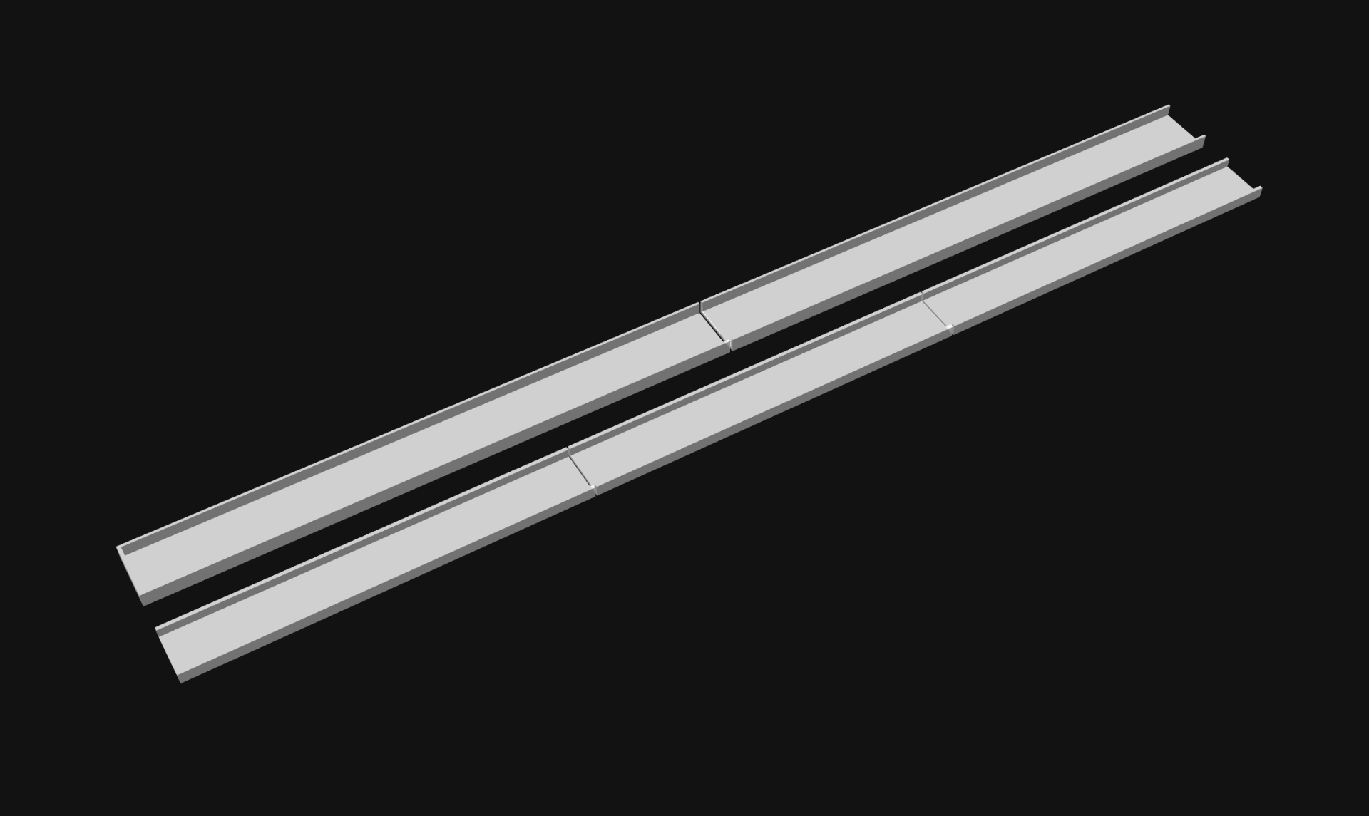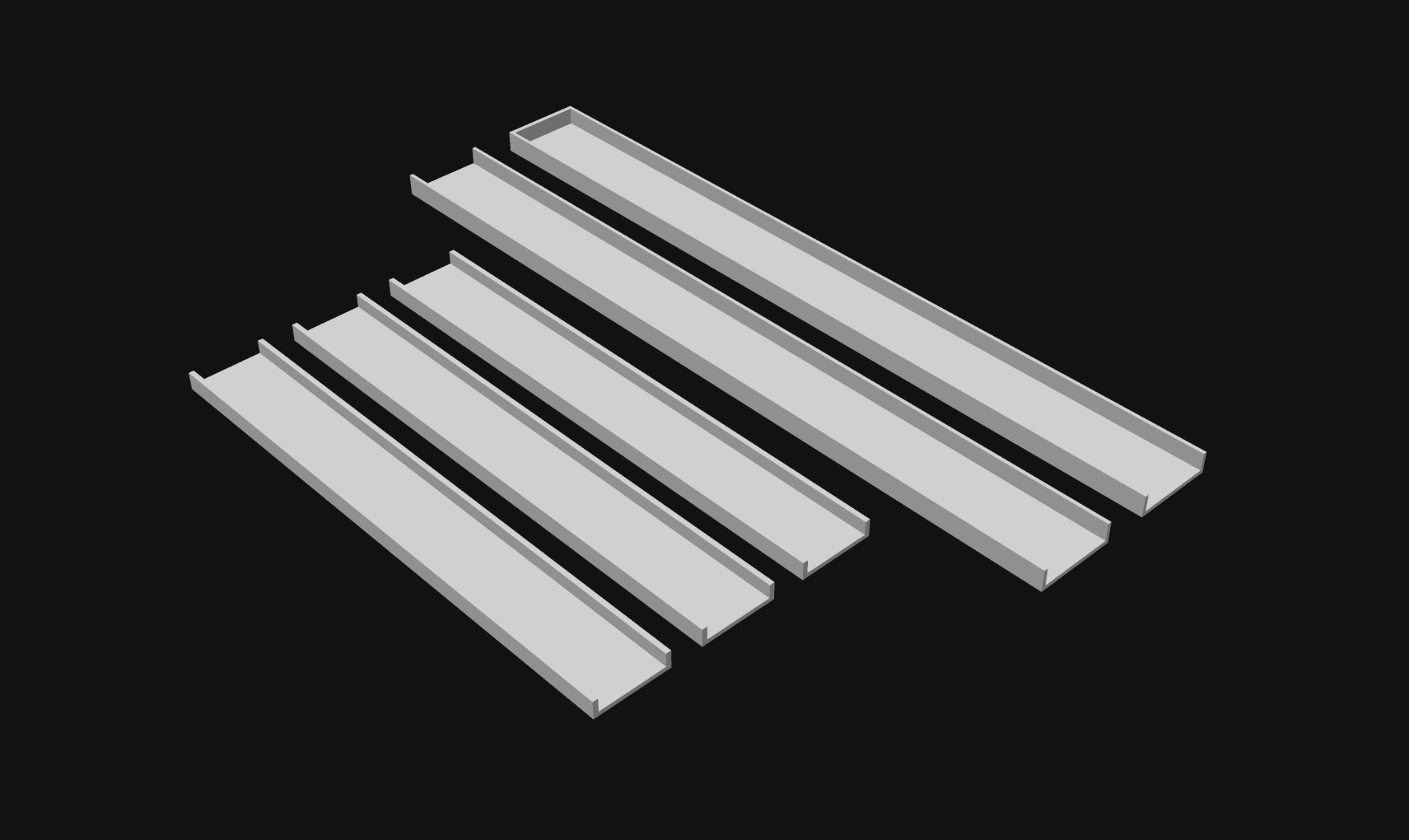 And here is what the pieces look like laid out so they are the length of the LED strip. I printed these with transparent PLA, which isn’t exactly clear, but it’s a thin print and the light shines through just fine.