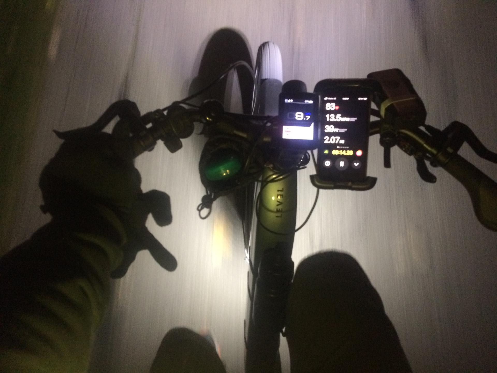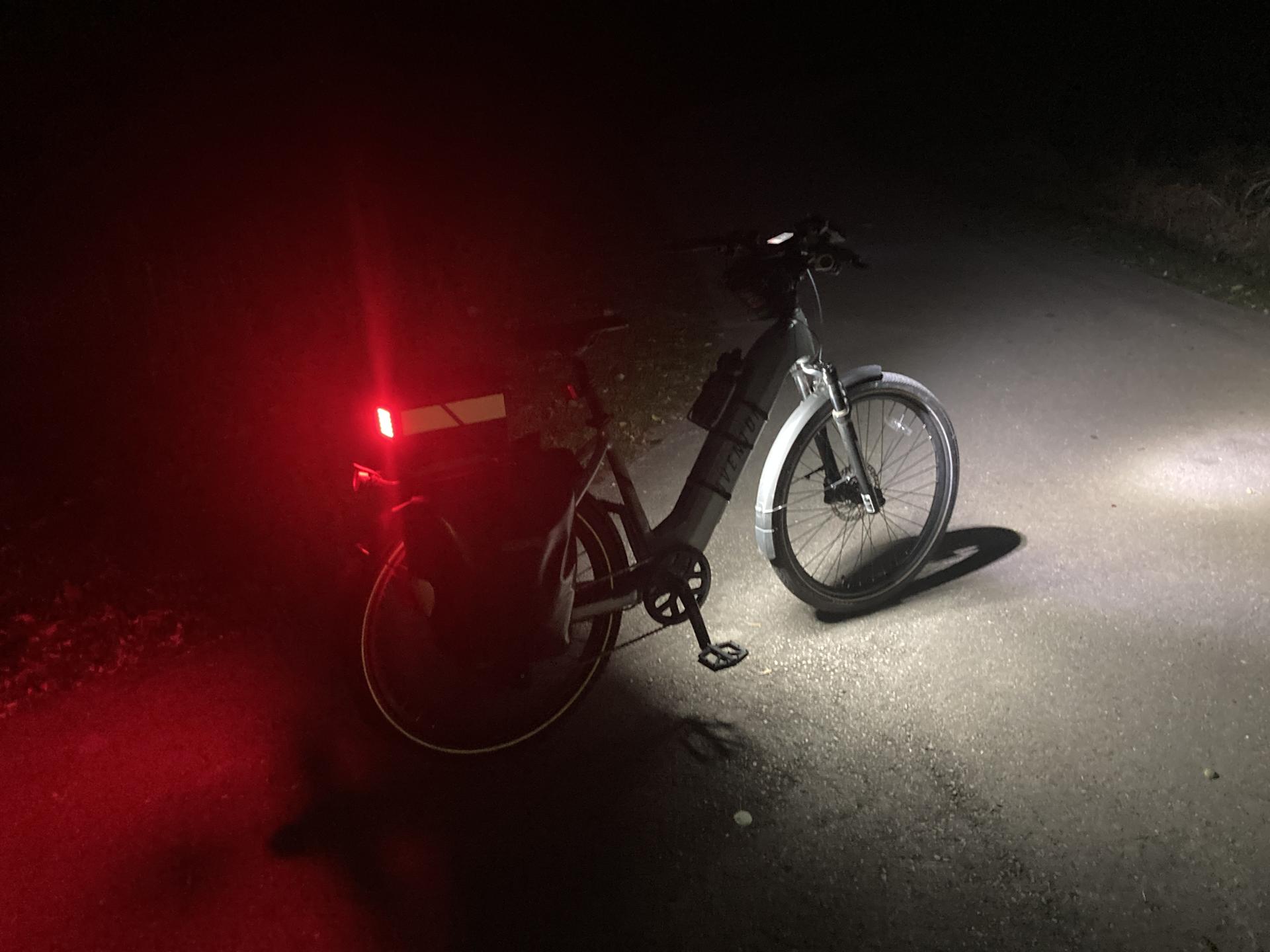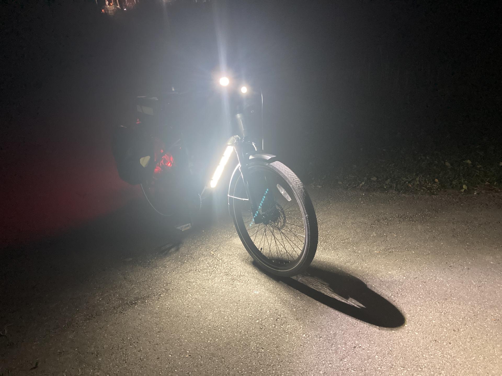 But hey, I think it works well! The above photo was taken on the Oak Leaf Trail, where there are no lights around, so it’s pretty much pitch dark there. The light definitely lights up the ground below and in front of the bike!