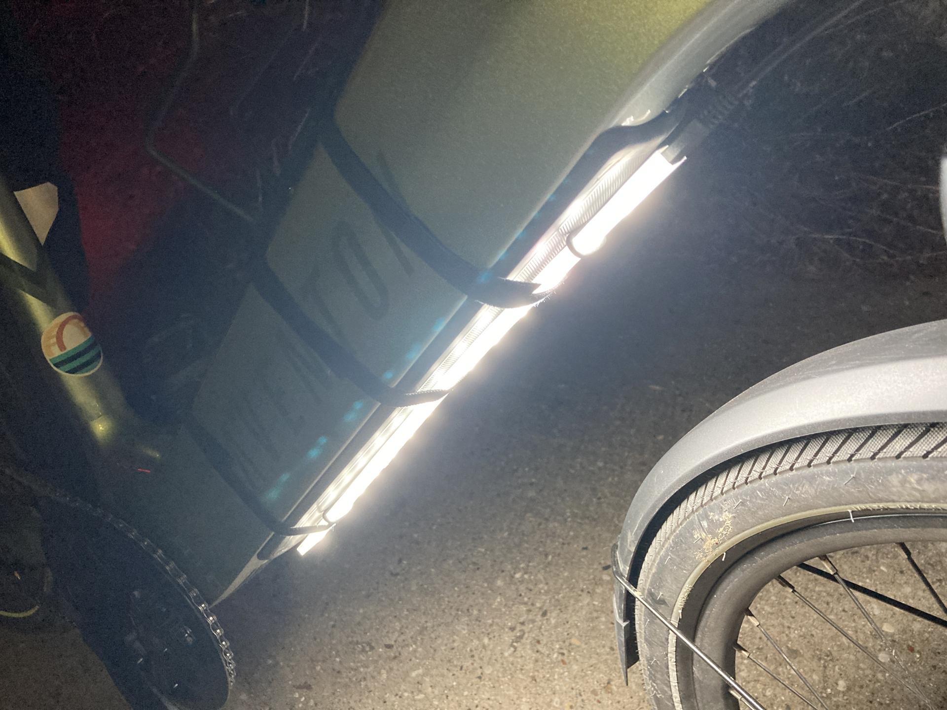 Here’s how I attach it to the downtube of the bike, which is where the battery is. The one little thing is that the strip could be about 3cm shorter and then I wouldn’t have to slide the whole strip up a bit to get to the charge port. (Maybe that’s a reason to make a new COB version?)