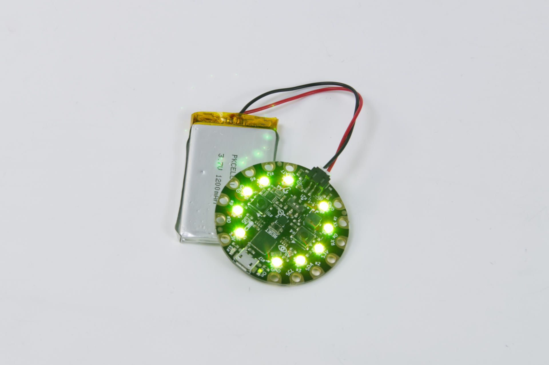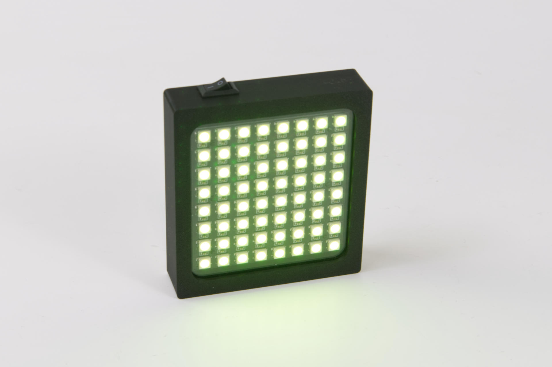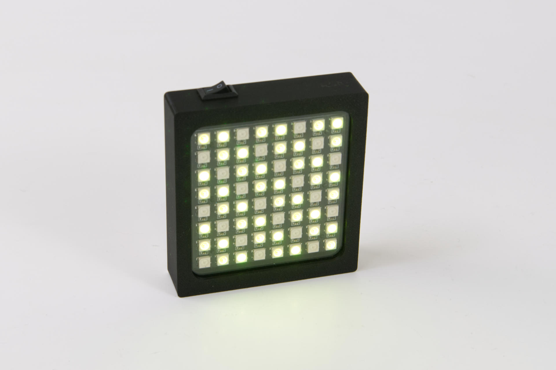 Let’s look inside! There’s a 8×8 NeoPixel panel, a microcontroller, a charge controller, and a lithium battery. Here are the parts: