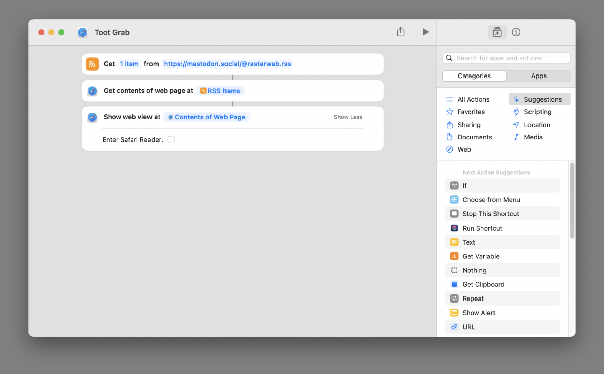 This one grabs the most recent Toot I’ve posted on Mastodon and displays it. You could change to use any RSS feed. Either another Mastodon account, or a blog you like, or any feed. (And it works on macOS, iOS, and iPadOS.)