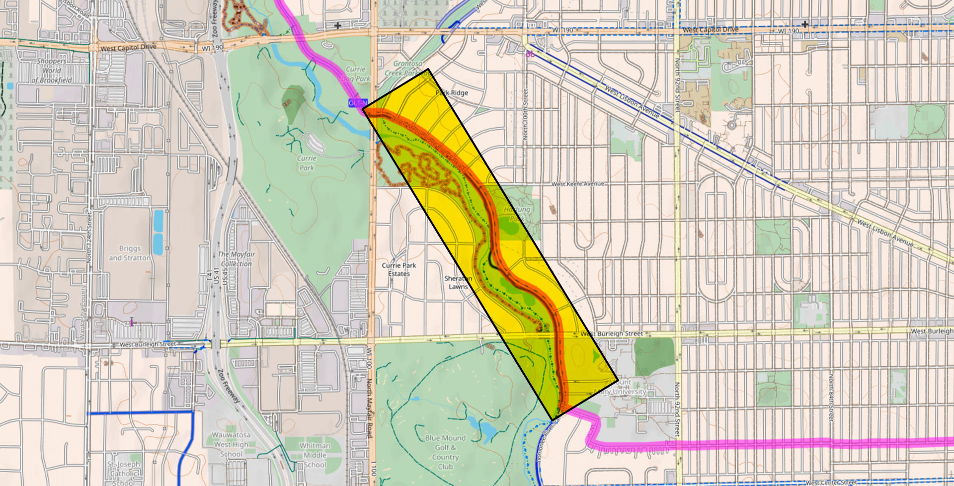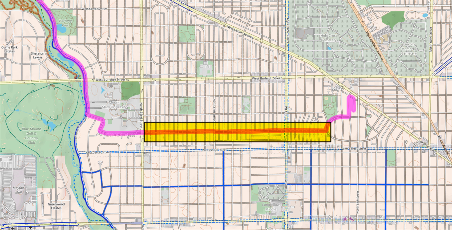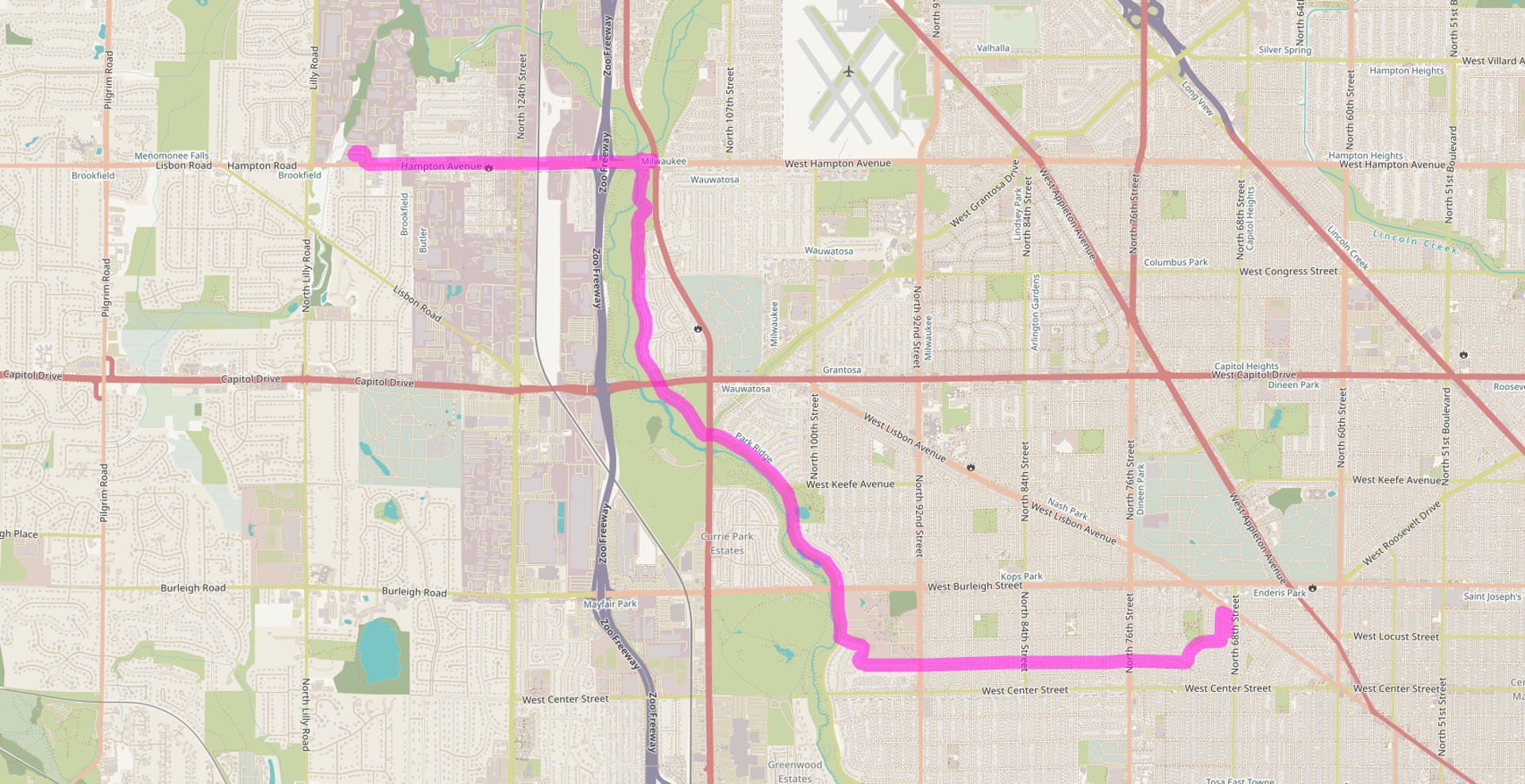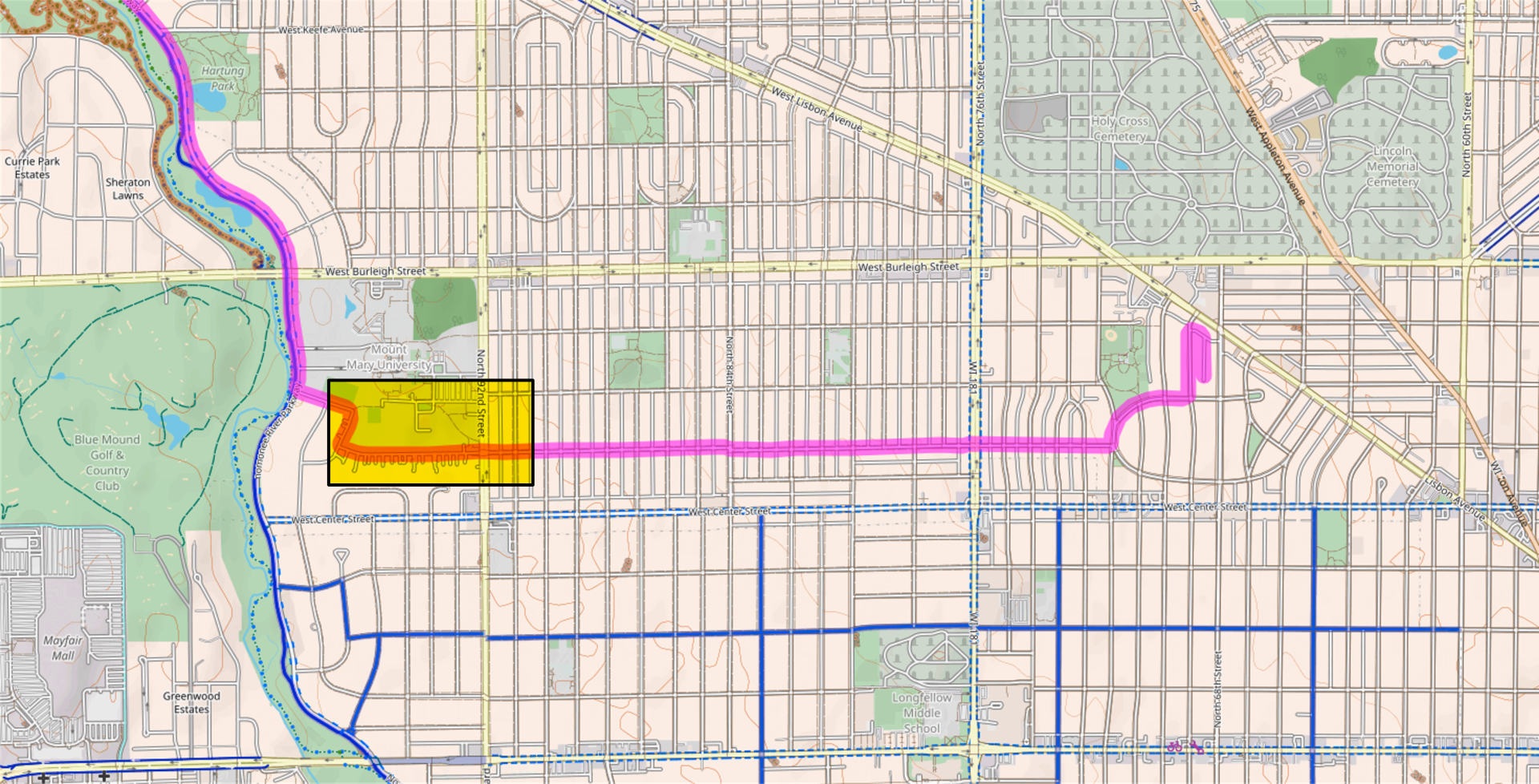 I take the Menomonee River Parkway riding with car traffic, trying to keep around 25mph if possible, and then almost always have to stop at Burleigh… Once past Burleigh it’s a smooth ride with no stops until I hit Mayfair Road.