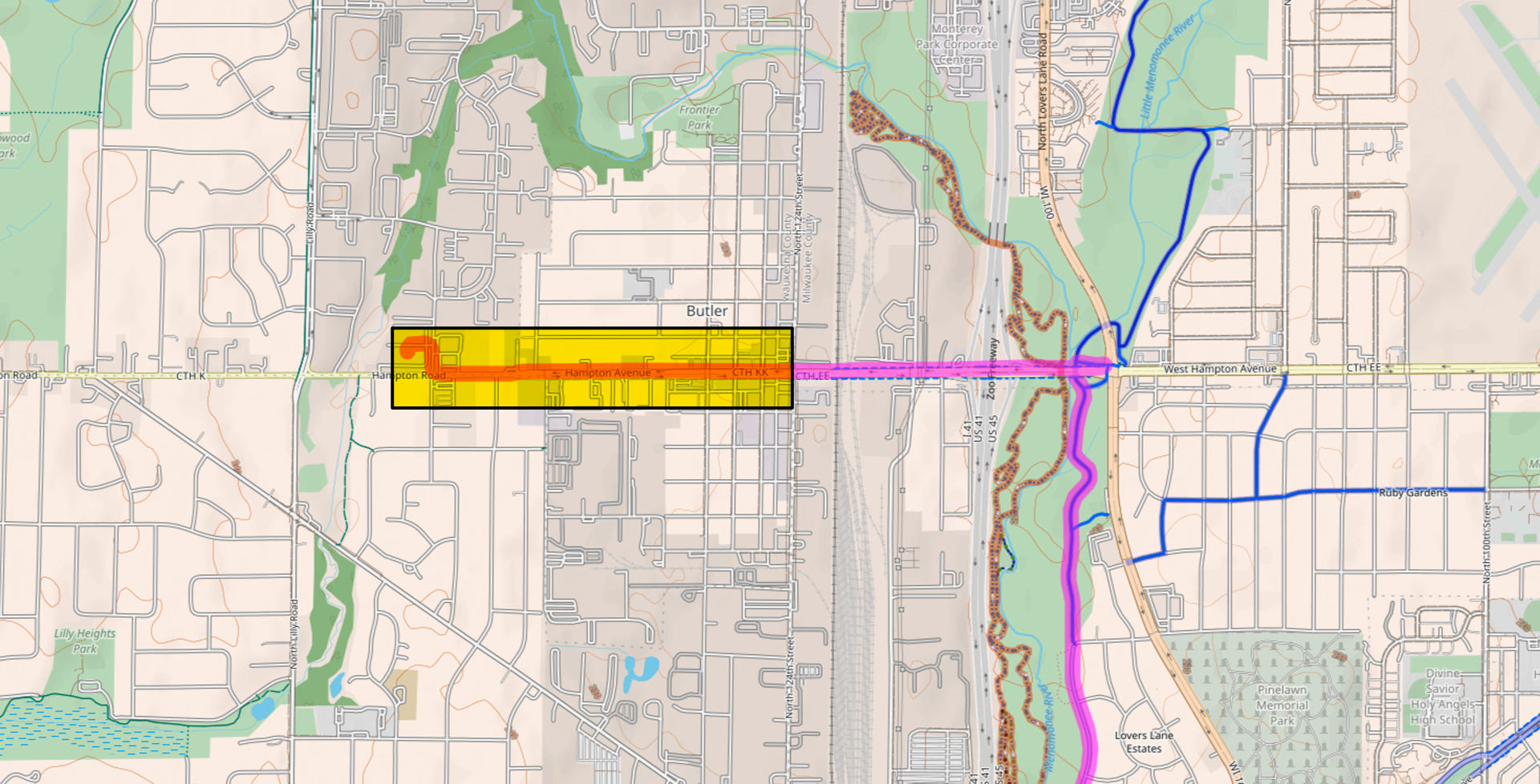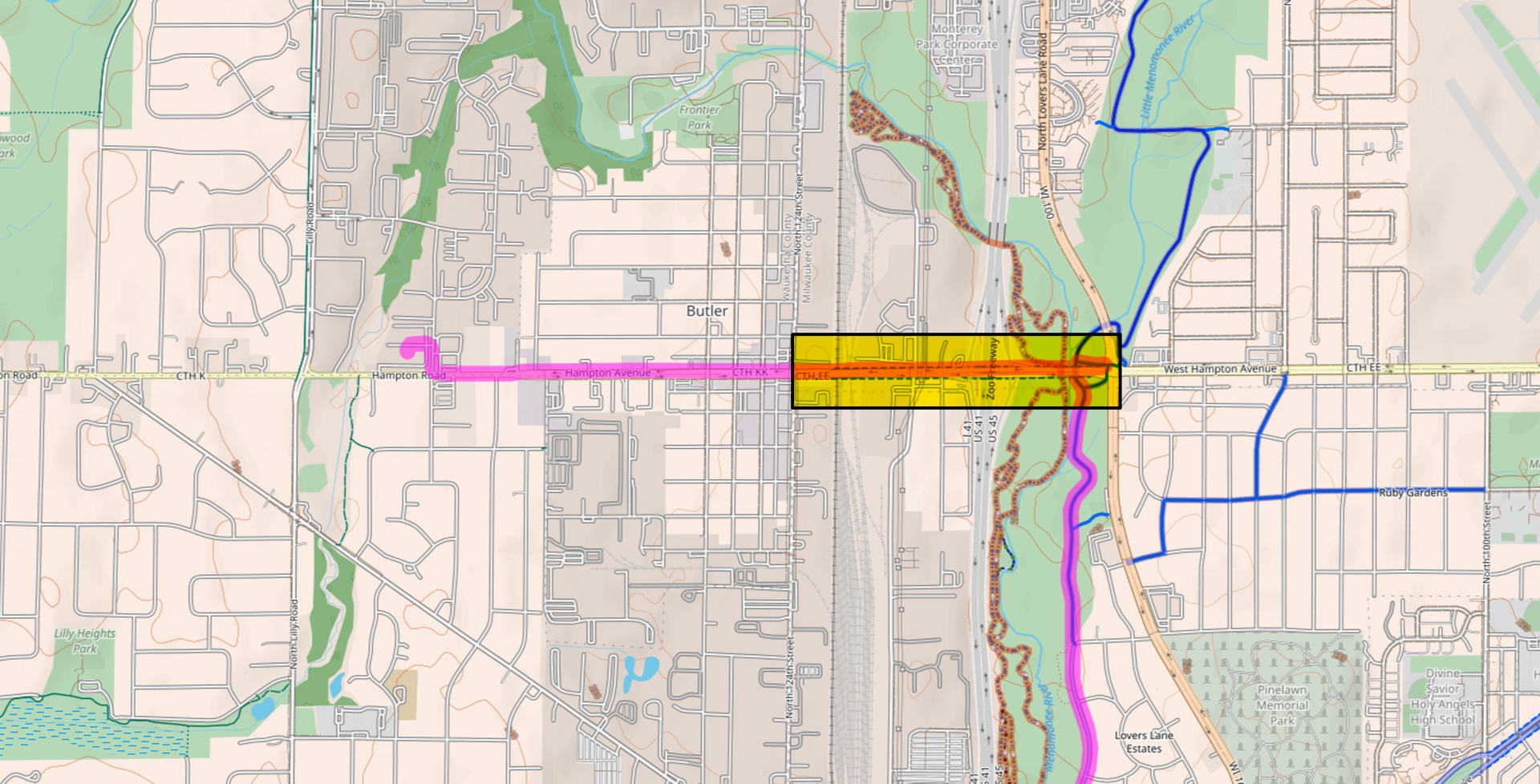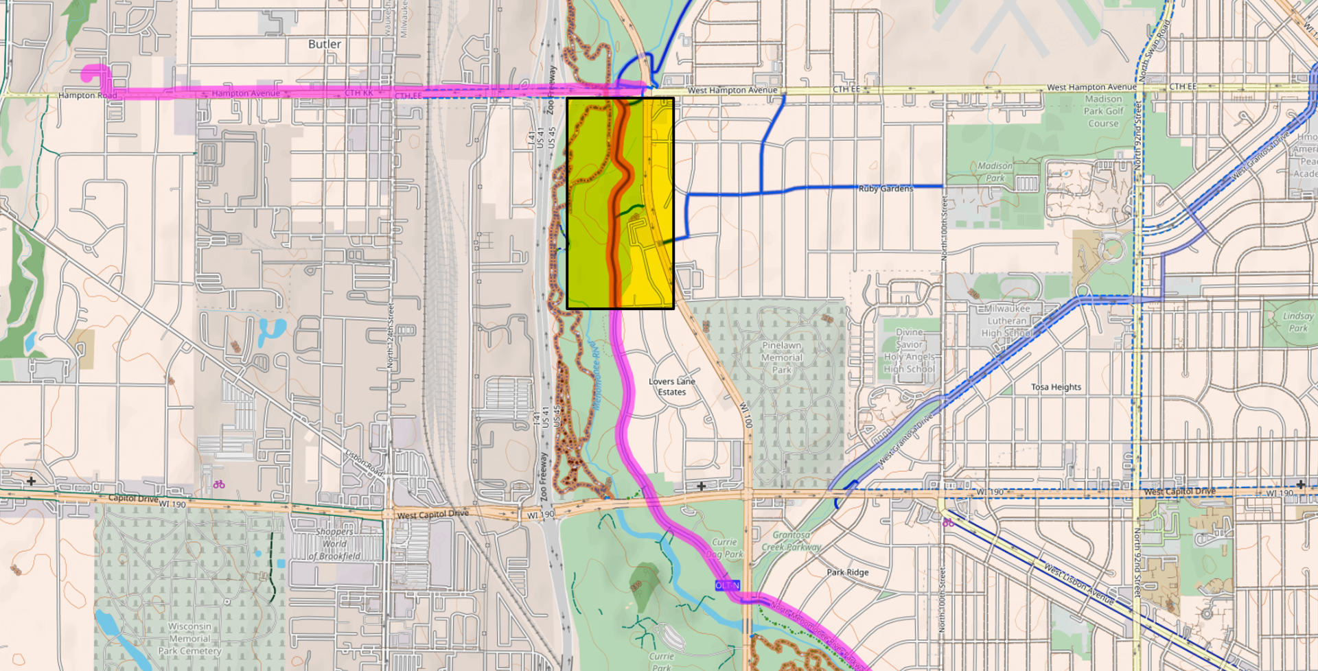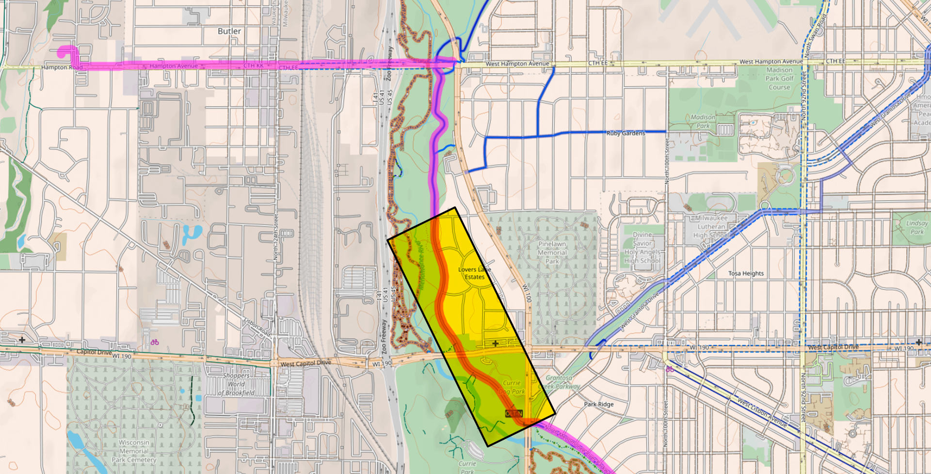 I take the Menomonee River Parkway riding with car traffic, trying to keep around 25mph if possible, and then almost always have to stop at Burleigh… Once past Burleigh it’s a smooth ride with no stops until I hit Mayfair Road.