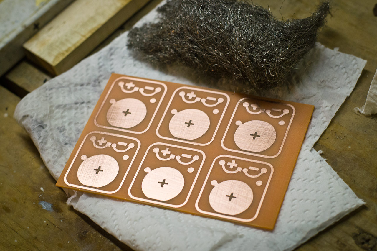 Since I’m etching my own boards, there’s a number of steps in the process. I’ve covered it all in the photos below, and I’ll add in a bit of text to explain things.